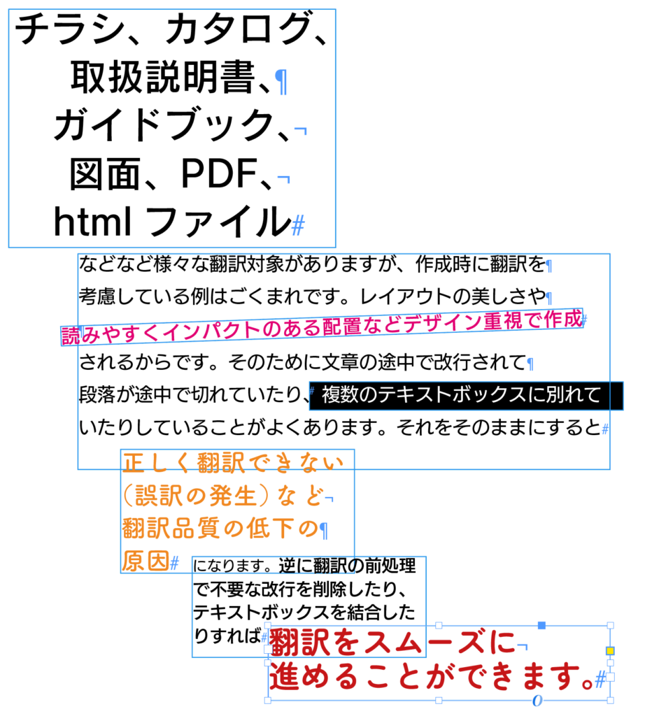 チラシ、カタログ、取扱説明書、ガイドブック、図面、PDF、htmlファイルなどなど様々な翻訳対象がありますが、作成時に翻訳を考慮している例はごくまれです。レイアウトの美しさや読みやすくインパクトのある配置などデザイン重視で作成されるからです。そのために文章の途中で改行されて段落が途中で切れていたり、複数のテキストボックスに別れていたりしていることがよくあります。上の例はちょっとやりすぎですが、翻訳データの分節が細切れになってテキストの順番もおかしな状態では、上手く翻訳できません。
